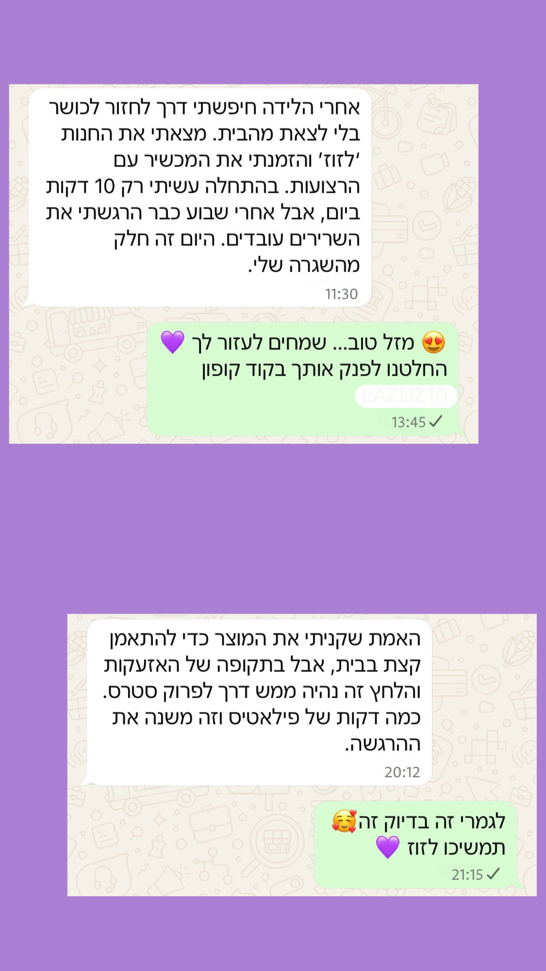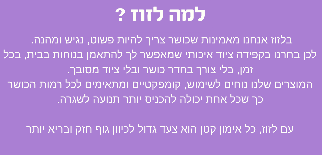 המוצרים של לזוז מאפשרים להכניס תנועה לשגרה בצורה פשוטה ונוחה. במקום לחפש זמן לחדר כושר - אפשר פשוט לפתוח את הציוד ולעשות אימון בבית.